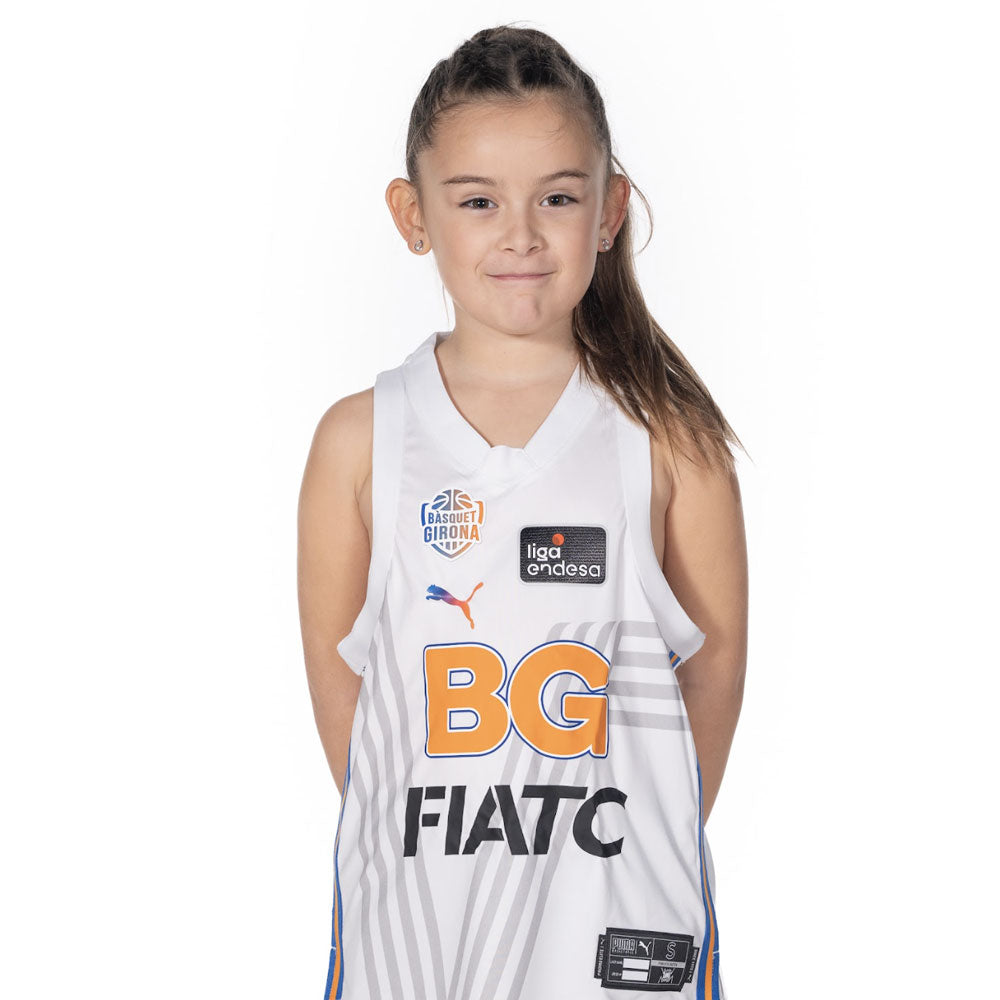 The PUMA third kit of the Bàsquet Girona 2025/26. The white, blue and orange design recovers the spirit of the 90s and pays homage to the historic white elastic of the Valvi Girona. The feeling and history of Girona basketball shines!