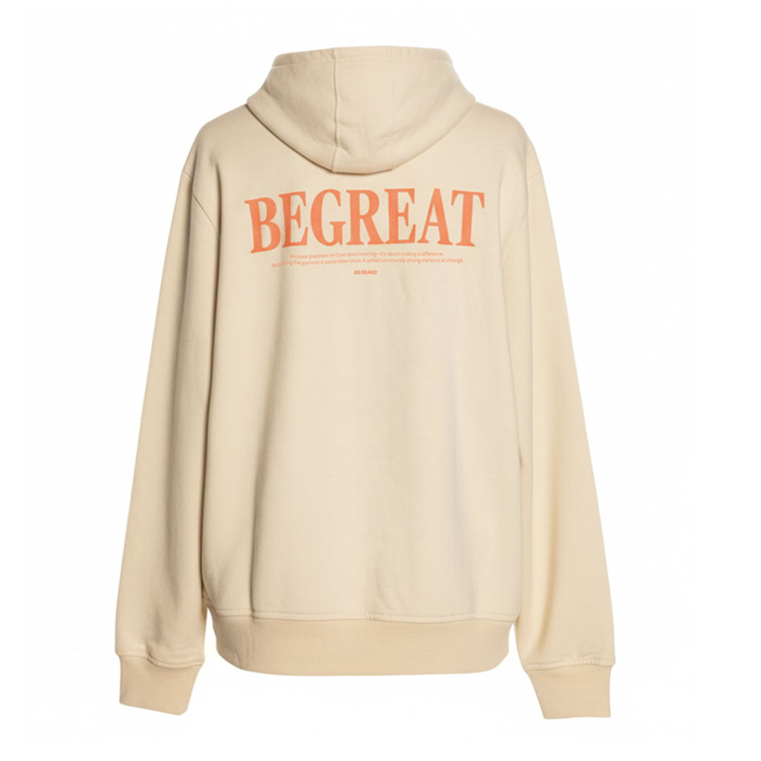 Vesteix la nova col·lecció de roba BeGreat! La dessuadora beix de BeGreat és una peça elaborada a partir de teixits 100% reciclats. En la part frontal llueix el logotip BG vermell salmó i, en la part posterior, hi ha situat la paraula completa BeGreat amb el subtitol “Because greatness isn’t about winning -it’s about making a difference. Redefining the game for a sustainable future. A united community driving the force of change”. La dessuadora beix BeGreat és ideal per per a l’ús diari, oferint una combinació de comoditat, funcionalitat i estil.
