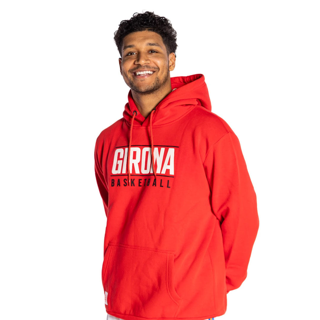 La dessuadora vermella casual del Bàsquet Girona 25/26. A la part pectoral llueix el logotip "GIRONA" pel sentiment de pertinença gironí i de reivindicació de la cultura i la història que representen la ciutat. A sota la paraula “BASKETBALL”, que accentua l'estil de carrer associat amb la moda esportiva.