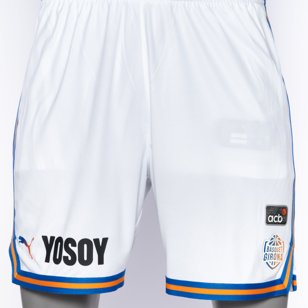 El pantaló de la tercera equipació PUMA del Bàsquet Girona 2025/26. El disseny blanc, blau i taronja recupera l’esperit dels anys 90 i ret homenatge a la històrica elàstica blanca del Valvi Girona. Llueix el sentiment i la història del bàsquet gironí!